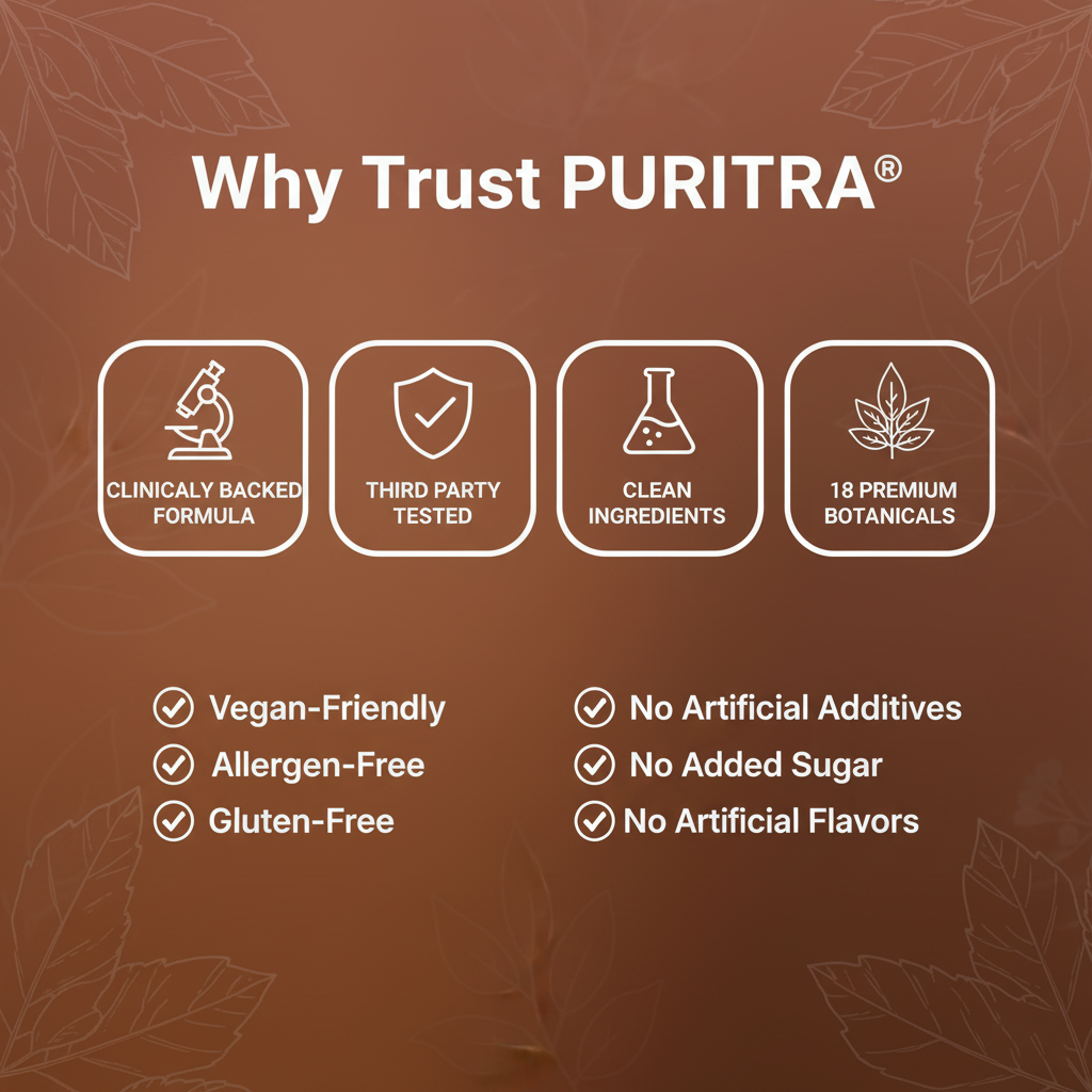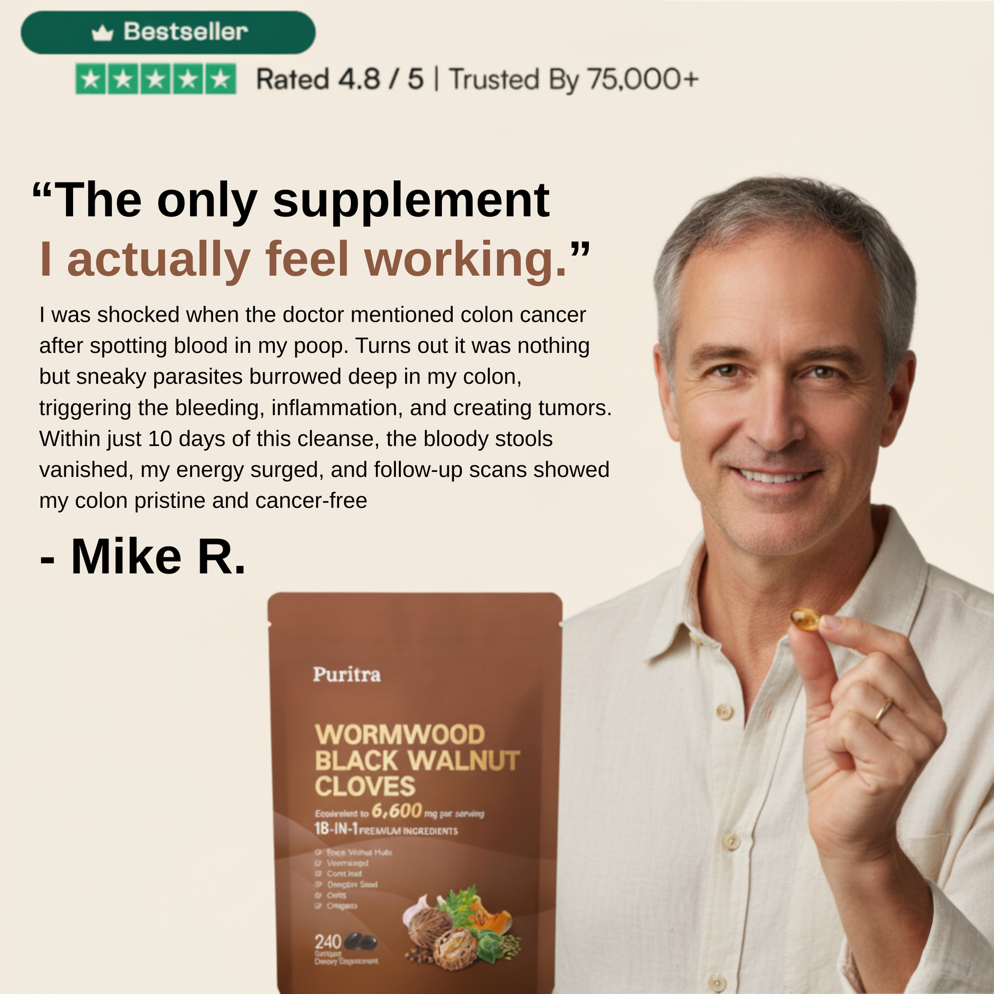 The black specs in the stool were my wake-up call. Hemorrhoids itched constantly, abdominal pain hit randomly, and straining fed the cycle until I flushed a cluster of tiny parasites mid-cleanse. Puritra broke the pattern: normalized bowels without drama, energy steady all day. I'm feeling unbreakable with the parasites purged for good.